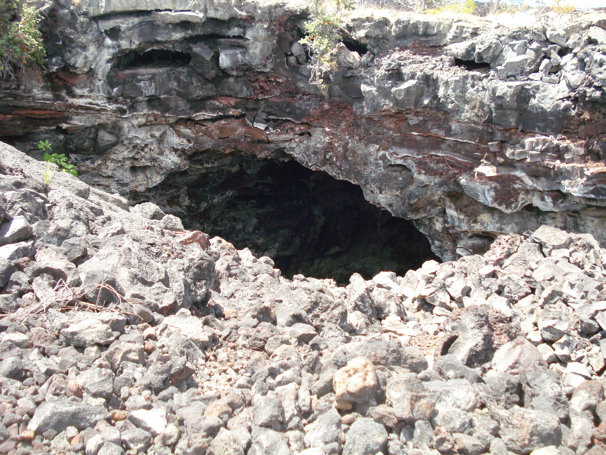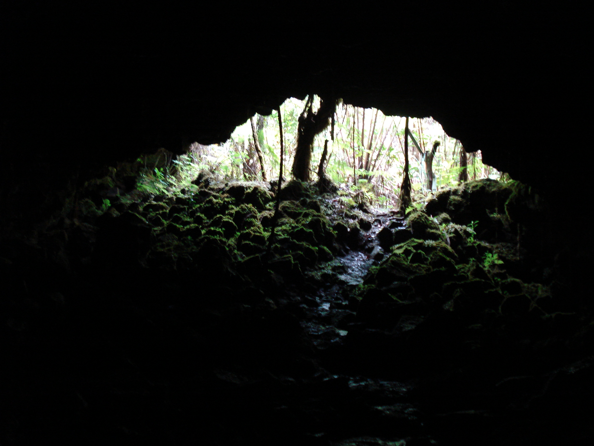 Kaumana Cave. “Kaumana Cave, located 5 miles above Hilo, was created during the 1880 eruption. It was formed as the surface of the pahoehoe cooled and hardened, insulating the molten lava within. A portion of the thin crust later collapsed, creating a skylight through which streams of lava could be seen pouring through subterranean passages. As the eruption abated, the channel emptied, leaving behind an extensive lava tube.”